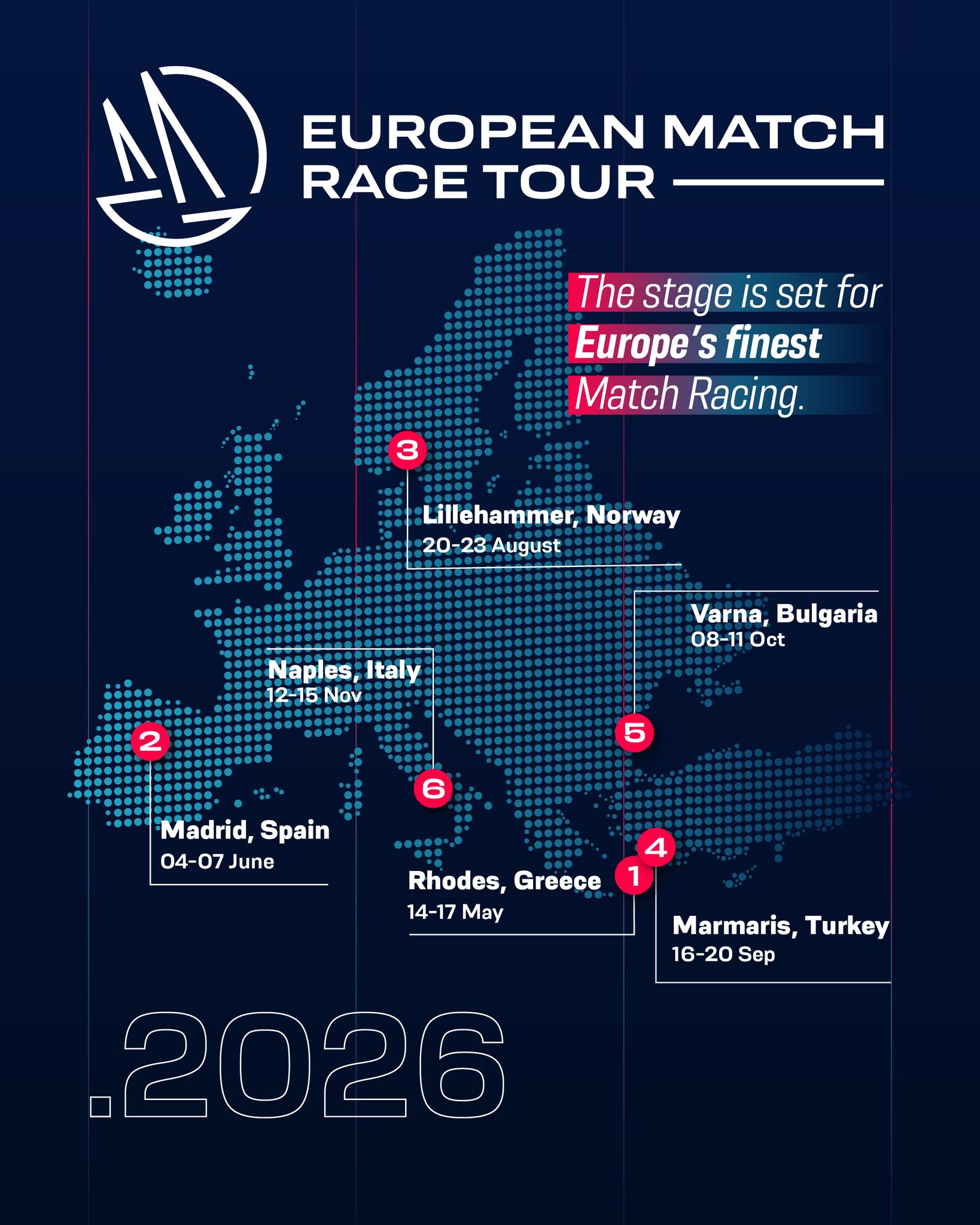 В края на 2025 г. Европейската ветроходна верига за мач-рейсинг (European Match Race Tour) обяви календара си за 2026 г., а преди дни официално потвърди датите за шестте кръга за новия сезон. България приема за трета поредна година стартове от веригата, след язовир Искър през 2024-та и Балчик през 2025-та, домакин ще бъде Варна в периода 8-11 октомври.